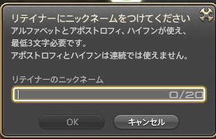 次にニックネームをつけます。幻想薬〈リテイナー〉というアイテムを使用することで、あとで外見種族も含めて変更が可能です。