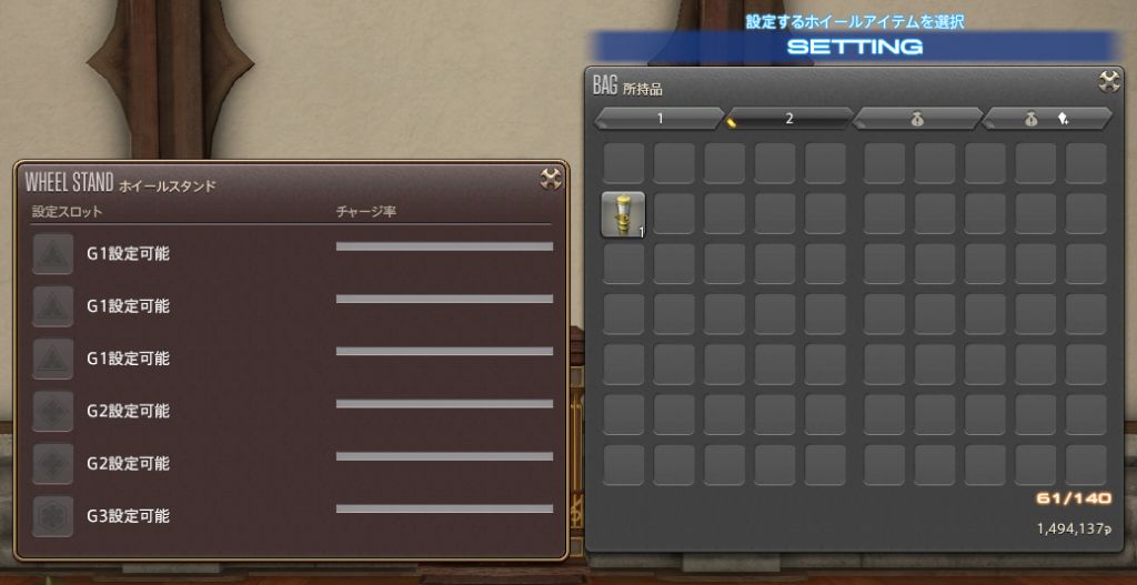 ホイールスタンドはひとつのFCハウスにひとつ、設置できるホイールもひとつだけです。ストックを作りたい場合は、チャージ率を確認しながら、なるべくマメに入れ替えてチャージしていくしかありません。