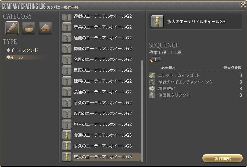 ②「カンパニー製作手帳」→「TYPE/ホイール」→「旅人のエーテリアルホイールG3」→「製作開始」